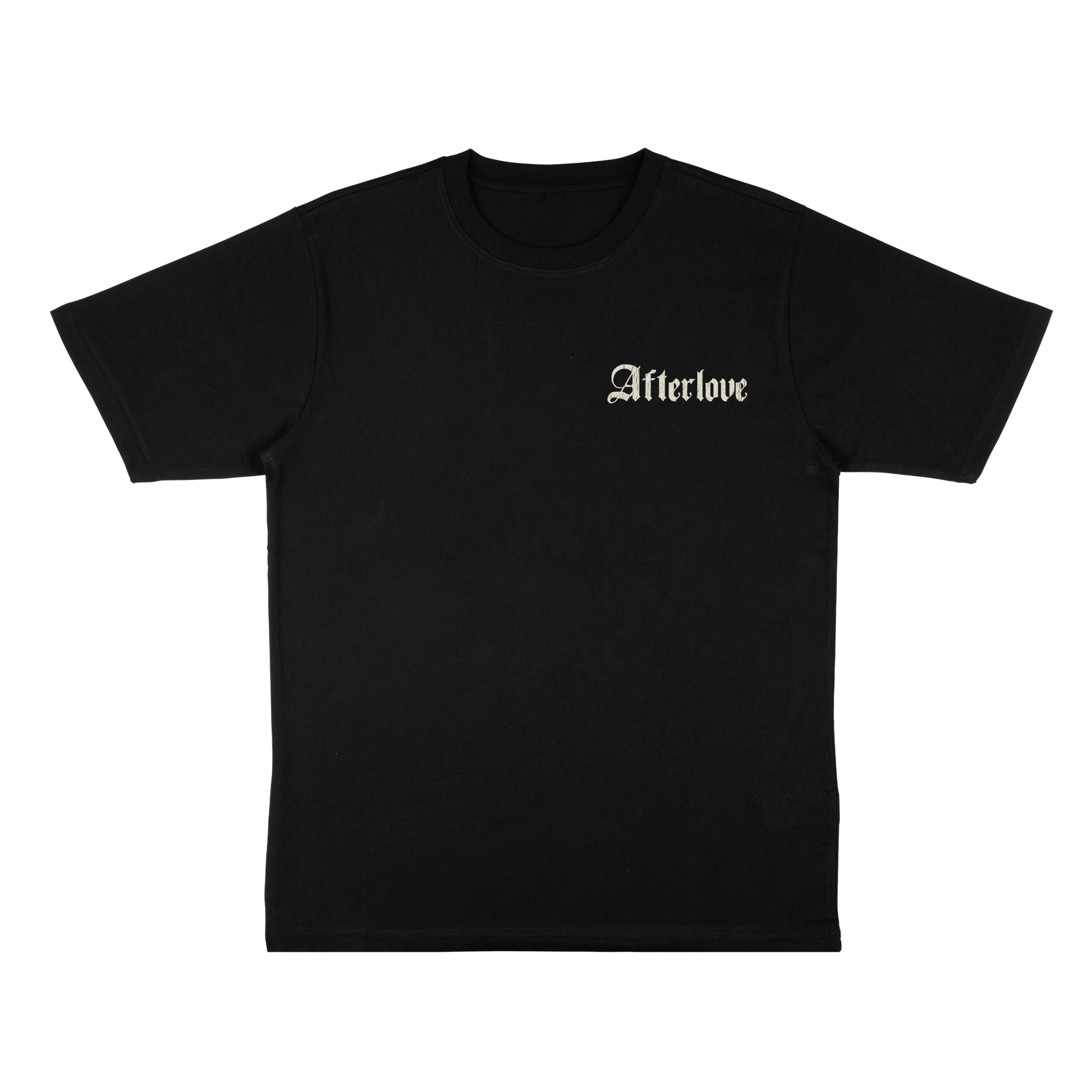Pre-order T-shirt from Afterlove with logo on the front and heart design on the back.