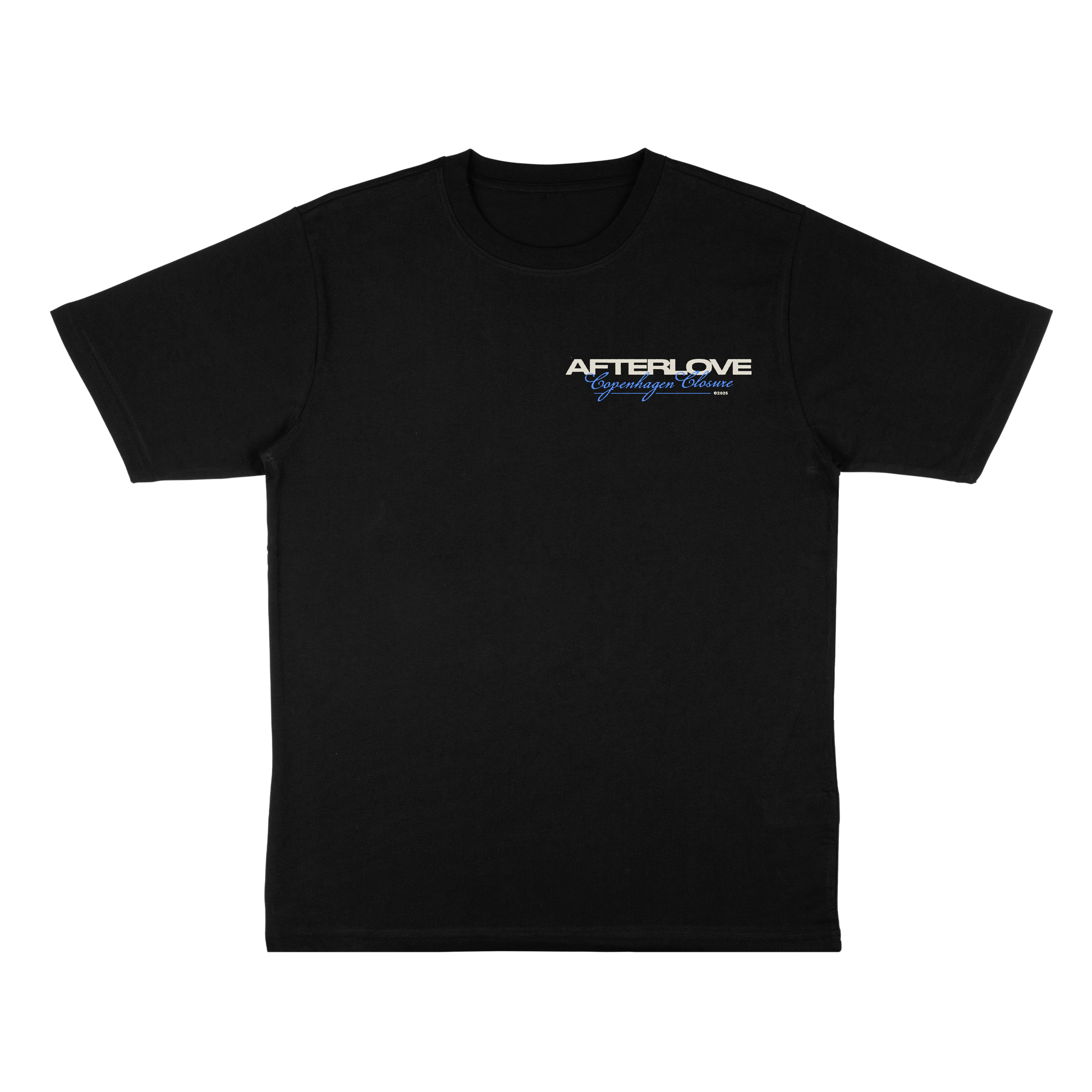 Pre-order T-shirt from Afterlove with logo on the front and sea design on the back.